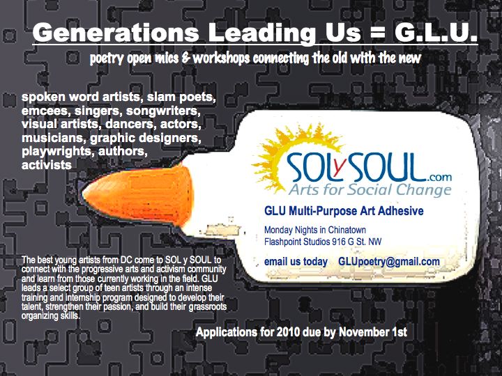 sol y soul is scouring the dmv for dedicated young teen artists who want to develop their skills through our generations leading us (glu) program. it is lots of fun, and a great experience for anyone who wants to learn how to organize arts and activism events. see the flier and email glupoetry@gmail.com for more info or to get an application sent to you.