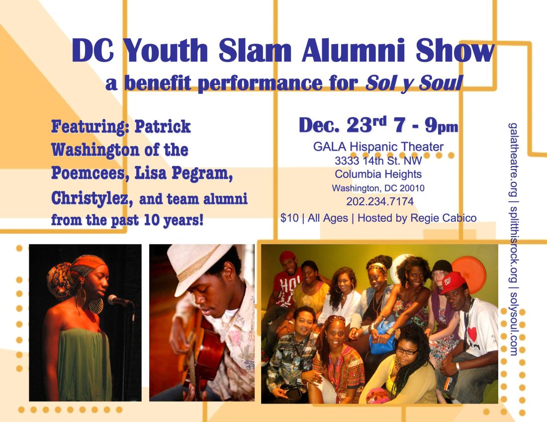 hot young artists keepin us warm in the winter time, and this show is straight on the surface of the sun. ten years of dc youth slam poetry teams together on one stage. we got christylez y’all!!! we got slam team coach and songstress lisa pegram. we got patrick washington of the poemcees. and that is just a few of the many greats we got coming through. regice cabico will be hosting. i will be djing and maybe spitting a couple pieces. it is well worth $50 per ticket, but we made them just $10 for you and your happy holidays. i hope to see you wednesday night in columbia heights.