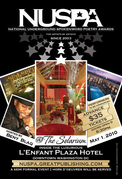 our friends at great publishing are sponsoring the 2010 national underground spokenword poetry awards on may 1st at the l’enfant hotel. you can still nominate poets if you register at nuspa.greatpublishing.com.