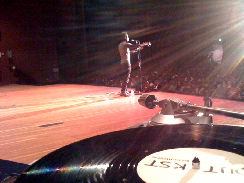 as if that wasn’t enough for one week, the very next day, thursday, i got to meet, do a poem and dj the event for saul williams! terpoets, the poetry group i helped create at the university of maryland, college park, brought saul to campus to perform and sign books. it was a big deal for me because his work has been very influential to me. this was my second time meeting him, so i am getting less star struck and treating him more like a human, which is a good thing. here is a pic from the best seat in the house.