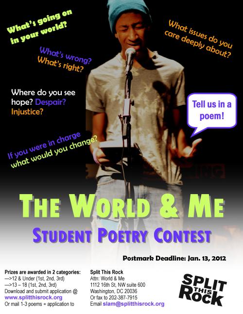 all of the students were invited to submit poems to Split This Rock’s Student Poetry Contest THE WORLD AND ME. see the fly-er flier below. you too, are invited, to invite your friends who are under 18 yrs old to submit their poetry online to this contest.