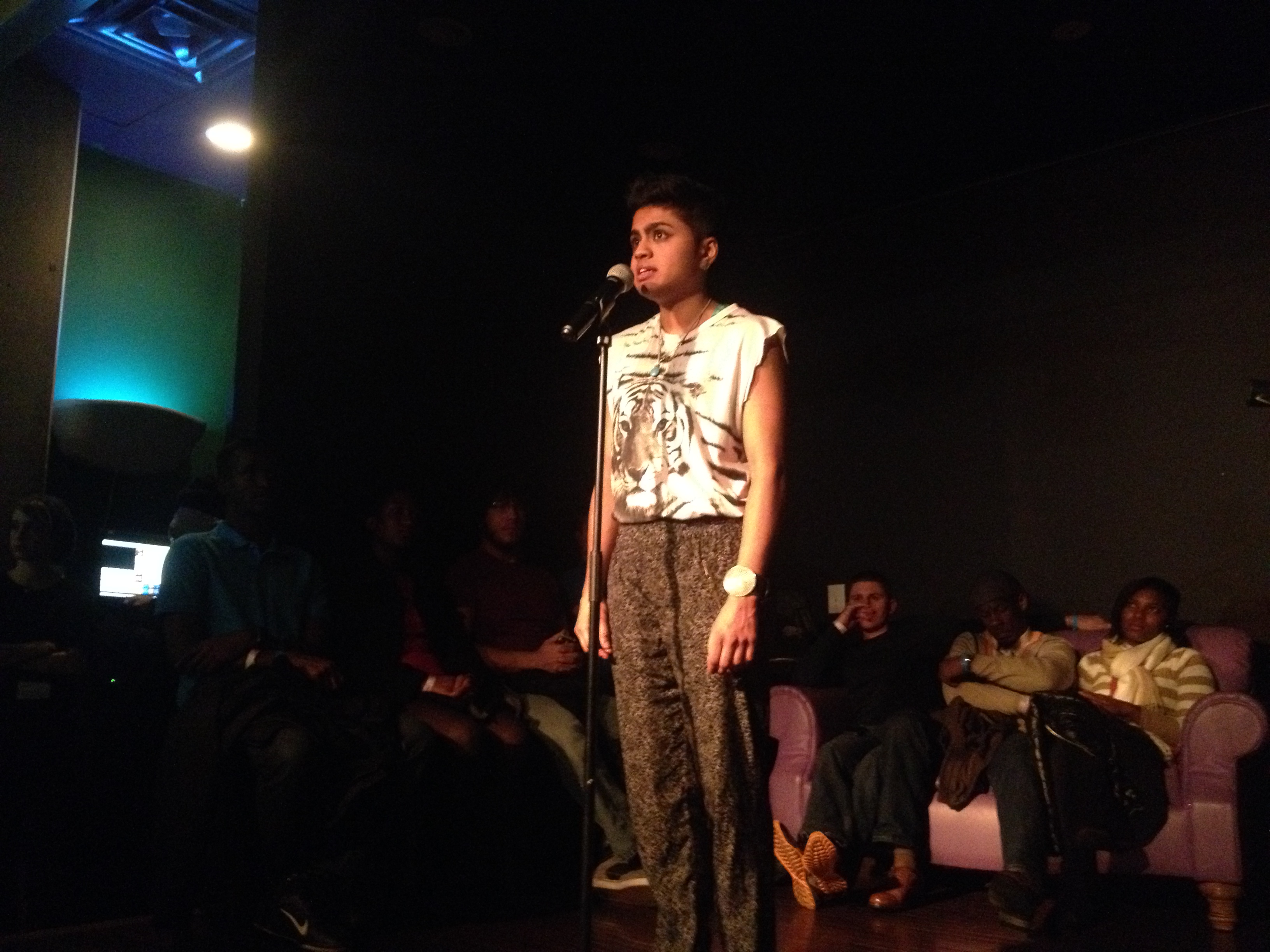 at my Busboys and Poets Wednesday night open mic we like to write a community poem involving everyone in the audience. we pass around the paper starting in the beginning of the show and everyone adds a line, so that by the end of the show we have a poem that we wrote together. this is that poem for Wednesday, January 15, 2014 at Busboys and Poets 5th & K Open Mic featuring Janani Balasubramanian (pictured below).
