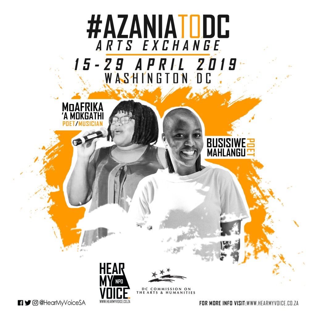 In 2020, we are bringing three poets from Pretoria, City of Tshwane, South Africa, to tour Washington, DC for their first visit to the United States. From 15 – 27 April 2020, Sibongile Fisher, Hope Netshivhambe, and Masai Sepuru will share their creative writing, performance, and teaching skills with DC audiences. On 28 April 2020, they will fly home to South Africa with DC poets/actors/emcees Dwayne Lawson-Brown and Drew Anderson, as well as Azania to DC director Jonathan B. Tucker. Dwayne and Drew will tour the City of Tshwane, South Africa from 29 April – 12 May 2020. The tours are organized and directed by JBT in partnership with Hear My Voice, Busboys and Poets, and sponsored by the DC Commission on Arts and Humanities.